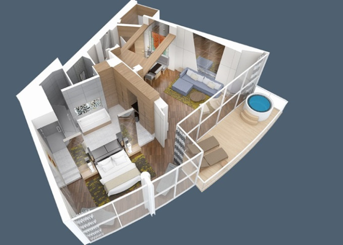 OP - Owner's Panoramic Suite 100 m² + balkón 15 m² s vírivkou. 2-podlažný apartmán. 17. paluba. Max 4 osoby. Výhody Royal Suite Star Class. 6 312 € 2 104 € za osobu